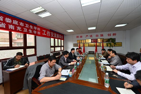 4月14日下午,湖南省娄底市卫生学校金建雄校长一行应邀来四川省南充卫生学校参观交流。四川省南充卫生学校校长彭海涛、党委书记王天宝、副校长田应伟、任大成、纪委书记王海军、工会主席谭小林、招就办、教务科、总务科以及学生科负责人与来访客人在和平路校区会议室座谈交流。