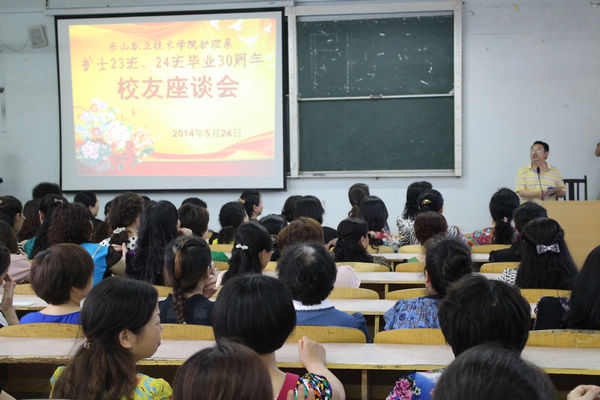 5月24日,毕业于30年前的原乐山卫校护士23班、24班部分同学在阶三教室举行了热烈欢快的校友座谈会。午4:30分,护士23班、24班的毕业生们,纷纷欢聚母校,共庆毕业30周年,共叙昔日师生情谊,共商母校发展大计。乐山职业学院副院长陈元进、护理系主任谯时文及23班、24班毕业生校友参加了此次座谈会。