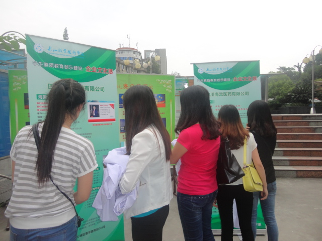 展出期间,乐山职业技术学院药学系宣传部提前将有关于海棠医药有限公司的海报放在活动场地内。海报中包括了海棠医药有限公司领导团队的简介、公司文化和对员工的培训等内容。此次企业文化展引起了同学们的集体围观和询问。这种展出方式更加贴近了同学们的日常生活,他们纷纷表示这种新颖的宣传方式更能促进大家主动学习、参观企业的文化,更好的了解省内医药公司的基本情况,为同学们毕业后的择业和创业之路提供了新的启发。