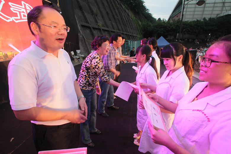 毕业的季节总是悲喜交加,有离开母校和同学的依依不舍 ,有即将踏上实习新旅程的激动之情,为了让即将离校的学生们感受到母校的关爱,为他们注入青春正能量,6月16日晚,在四川卫生康复职业学院足球场举行了“情系盐都·圆梦川康”2014年毕业晚会,学院领导及各行政部门负责人、教师、学生及学生家长共4000余人观赏表演。首先曾晓奇院长为毕业生做了慷慨激扬的毕业致辞,对同学们顺利毕业表示了衷心的祝贺并提出了殷切的期望,希望毕业学子踏出校门依然能够传承卫康院“大仁求学,大医济人”的校训,爱岗敬业、乐于奉献,实现自我价值的同时有所创造,为社会作出贡献!