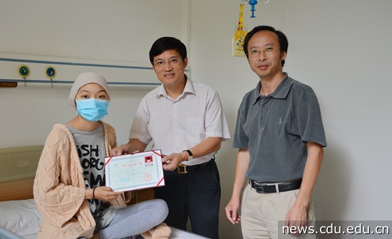 成都大学中职部2014届毕业生王思培同学因身患急性淋巴细胞白血病无法回校参加学校举行的毕业典礼,中职部主任、成都卫生学校校长尤康,党总支书记席原、就业办负责人代表中职部全体师生前往省医院草堂病区,向还在住院治疗中的王思培同学颁发了毕业证书,让她拥有了一场属于自己的毕业典礼。