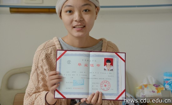 王思培手捧心爱的毕业证书心情无比激动,她非常感谢学校师生和领导对自己的关心。她表示要积极配合医生的各种治疗,依然保持一种乐观的心态对病魔进行抗争,虽然目前癌细胞得到了暂时控制,但要完全治愈还要等待骨髓移植。王思培最后说,她将记住学校师生和社会各界对自己的爱心捐助,表示要妥善用好每一笔善款,以坚强的毅力和乐观的心态面对病魔、战胜病魔,用实际行动报答社会、感恩社会。
